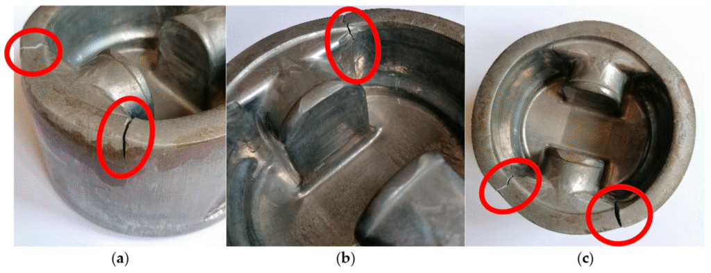 Cracks happen when the metal is stretched, bent, or compressed too much during forging, especially if it’s too cold or brittle. This causes it to break instead of flow smoothly.