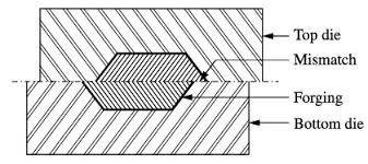 Mismatch is a defect where the upper and lower parts of the forged piece do not line up correctly. This causes a step or offset along the joint, making the part look uneven or misaligned.