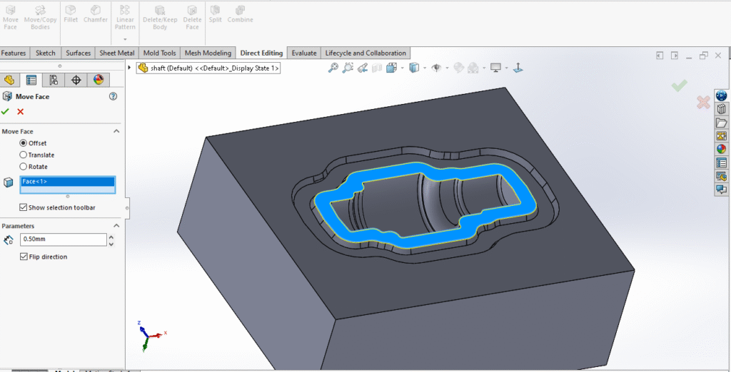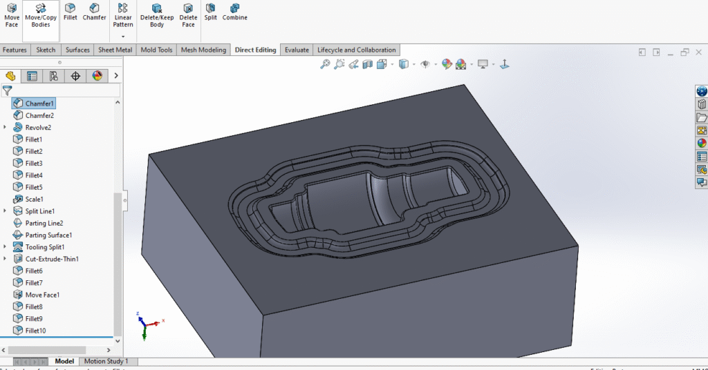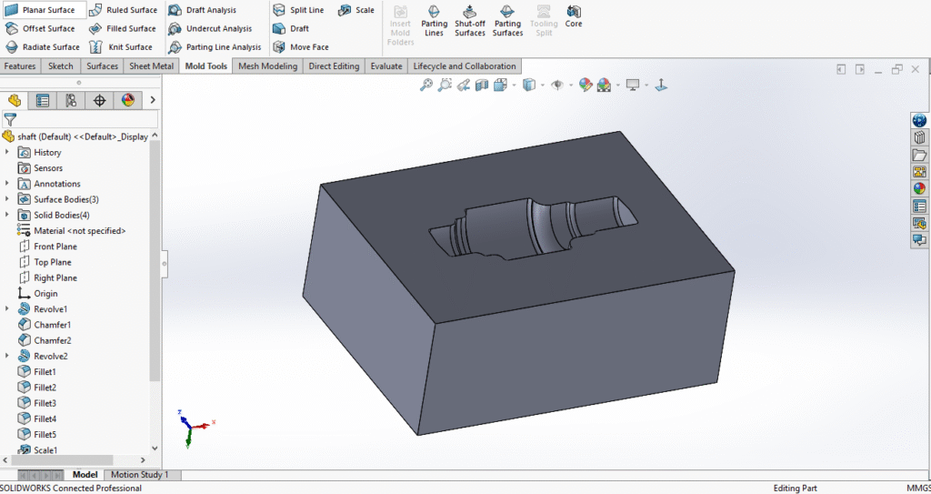 At this stage, we have created the impression of the part into the forging die. To achieve this, I am using the “Tooling Split” feature available in SolidWorks, which is a powerful tool designed specifically for mold and die design. This function allows us to divide the die into separate sections based on the geometry of the part. Before using Tooling Split, I first generate the parting surface by utilizing the “Parting Surfaces” option, which is found in the Mold Tools section of SolidWorks. The parting surface defines where the die will separate or open, serving as a critical boundary between the two halves of the die.